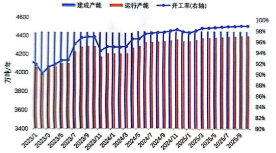 2025年10月,國內(nèi)電解鋁生產(chǎn)能力保持高位持穩(wěn)。截至10月底建成產(chǎn)能4470萬噸/年,運行產(chǎn)能4420萬噸/年,與上月基本持平。未來兩個月,隨著扎鋁二期35萬噸/年建成,預(yù)計2025年底建成產(chǎn)能將達到4505萬噸/年。在產(chǎn)能幾近“天花板”,開工率始終維持98%以上背景下,無論是產(chǎn)能還是產(chǎn)量的增長空間都極為有限。